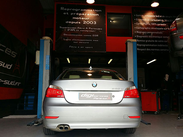 DEFAP et reprogrammation moteur d’un BMW 530 D 231 cv. Nous augmentons la puissance de 231 cv à 280 cv et nous améliorons le couple de 500 Nm à 610 Nm. Nous avons également désactivé la vanne EGR.