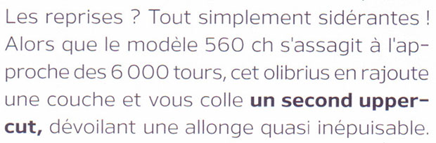 Les performances sont impressionnantes, aussi bien en reprises, en accélérations et en vitesse maximale.